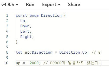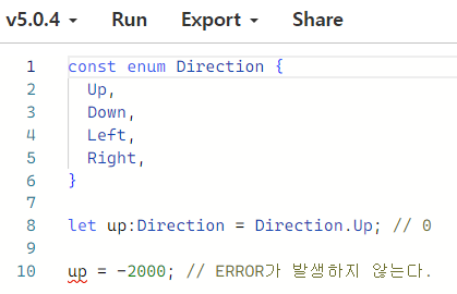 5.0.4에서는 Type '-2000' is not assignable to type 'Direction'. 에러가 발생한다 const enum과 as const 객체의 장단점