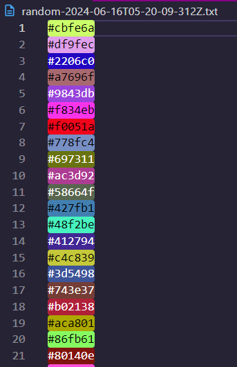 npx cht random 100 -f실제로 실행해보면, 100개의 hex 색상이 하나의 txt 파일에 쓰여진다.