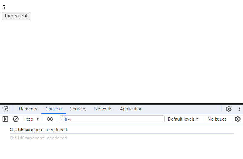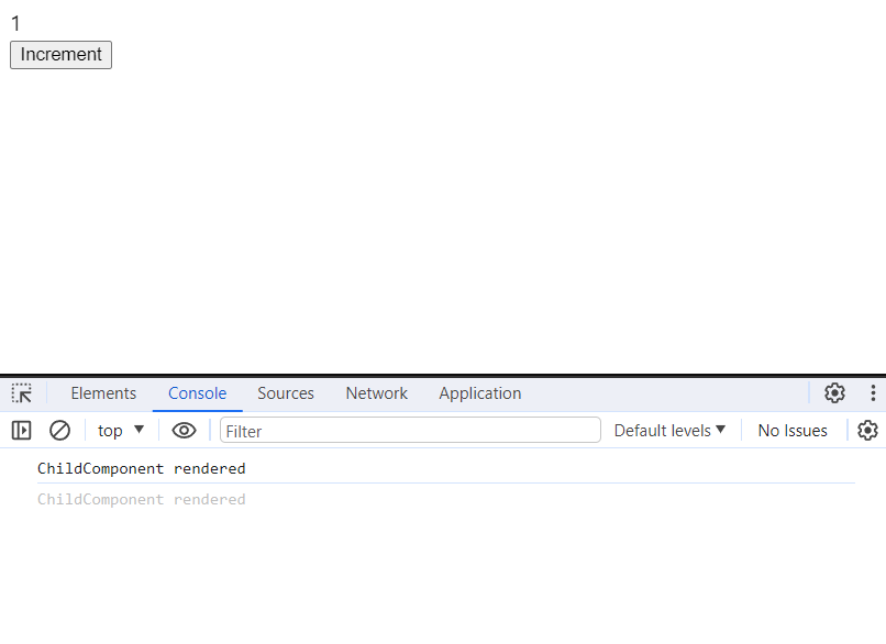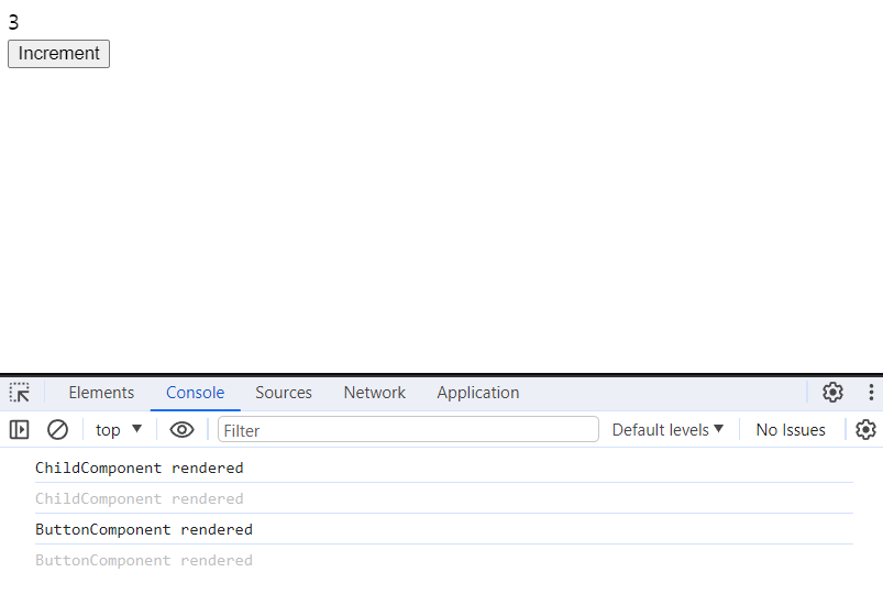 위 코드에서 버튼을 클릭하면 `value`이 증가하고, `value` 가 변경될 때마다 ChildComponent와 ButtonComponent가 각각 렌더링되는 과정을 콘솔에서 확인할 수 있다.