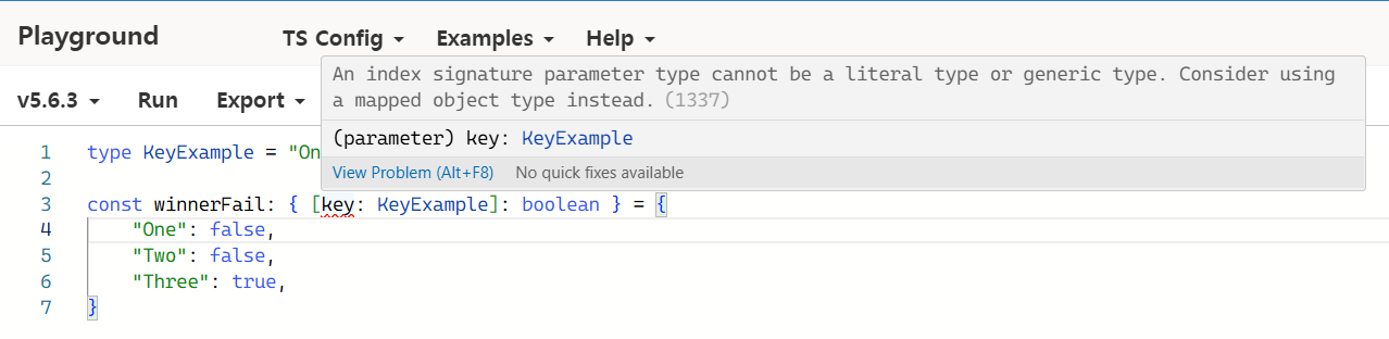 타입스크립트 플레이그라운드 (타입스크립트 버전은 보시다시피 V5.6.3) 에러가 발생한다.