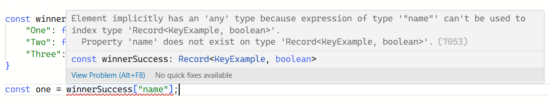 type KeyExample = "One" | "Two" | "Three"; const winnerSuccess: Record<KeyExample, boolean> = { "One": false, "Two": false, "Three": true, }Record를 사용하여 다음과 같이 작성하면,