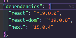 생성한 next 프로젝트 package.json을 확인해보면, next 15.0.4 기준으로 react 19 버전이 설정된다.