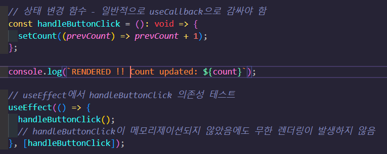 이제 확인할 것은 진짜로 useCallback이 필요한 (useEffect 내부에서 상태를 변경하는 함수를 호출했을 때, dependency로 함수가 걸리고, 이 함수가 메모라이제이션이 되야하는...) 상황에서 useCallback 없이 잘 작동하는지이다.