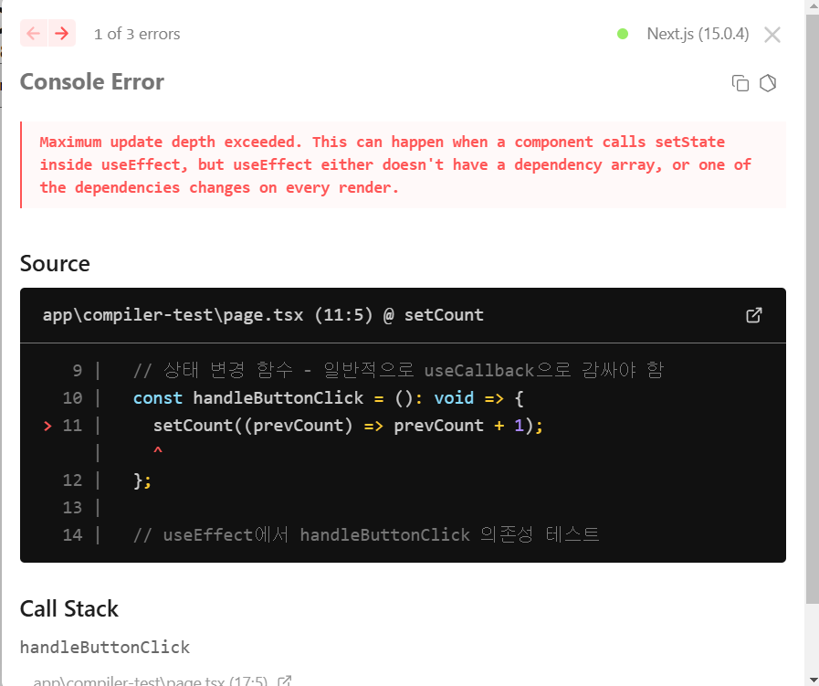 실제로 react compiler를 설정하지 않은 상태에서는 무한 렌더링 문제가 발생한다.