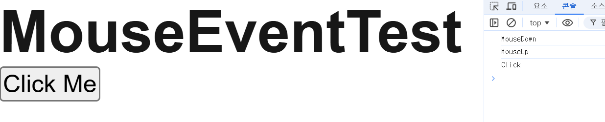 "use client"; const MouseEventTest = () => { const logEvent = (eventName: string) => { console.log(eventName); }; return ( <div> <h1>MouseEventTest</h1> <button onMouseDown={() => logEvent("MouseDown")} onMouseUp={() => logEvent("MouseUp")} onClick={() => logEvent("Click")} > Click Me </button> </div> ); }; export default MouseEventTest;위의 예제를 실행해보면 !