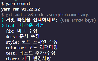 import { $, quote } from "zx"; import inquirer from "inquirer"; const promptCommitMessage = async () => { return inquirer.prompt([ { type: "list", name: "type", message: "커밋 타입을 선택하세요:", choices: [ { name: "feat: 새로운 기능", value: "feat" }, { name: "fix: 버그 수정", value: "fix" }, { name: "docs: 문서 수정", value: "docs" }, { name: "style: 코드 스타일 수정", value: "style" }, { name: "refactor: 코드 리팩터링", value: "refactor" }, { name: "test: 테스트 추가/수정", value: "test" }, { name: "chore: 기타 변경사항", value: "chore" }, ], }, { type: "input", name: "scope", message: "영향받는 범위(scope)를 입력하세요 (예: 컴포넌트 이름, 생략 가능):", validate: (input) => input.length <= 10 ? true : "범위는 최대 10글자까지만 입력하세요.", }, { type: "input", name: "subject", message: "변경 사항의 요약을 입력하세요:", validate: (input) => input.length > 0 && input.length <= 100 ? true : "요약은 1글자 이상, 100글자 이하로 입력하세요.", }, ]); }; // main 실행 (async () => { const { type, scope, subject } = await promptCommitMessage(); const scopeStr = scope ? `(${scope})` : ""; const commitMessage = `${type}${scopeStr}: ${subject}`; console.log("\n📝 생성된 커밋 메시지:"); console.log(` ${commitMessage}\n`); const { confirmCommit } = await inquirer.prompt({ type: "confirm", name: "confirmCommit", message: "이 메시지로 커밋하시겠습니까?", }); if (confirmCommit) { await $`git commit -m ${commitMessage}`; console.log("🚀 커밋 완료!"); } else { console.log("⚠️ 커밋이 취소되었습니다."); } })();해당 스크립트를 실행하여 커밋을 하면, 다음과 같이 prefix를 선택할 수 있고 커밋 컨벤션에서 실수를 할 일은 없을 것 같다 😊