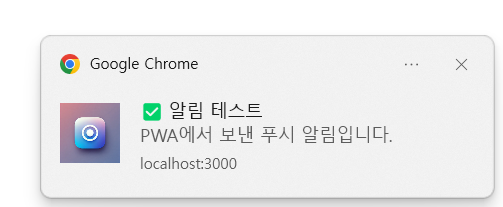 apps/layout.tsx에 다음과 같이 코드를 추가하고 테스트해보자import './globals.css'; import type { Metadata } from 'next'; import localFont from 'next/font/local'; import React from 'react'; import EnablePwa from './components/EnablePwa'; import PushTestPwa from './components/PushTestPwa'; export default function RootLayout({ children, }: Readonly<{ children: React.ReactNode; }>) { return ( <html lang="ko"> <body className={`${geistSans.variable} ${geistMono.variable}`}> {children} <EnablePwa /> <PushTestPwa /> </body> </html> ); }
