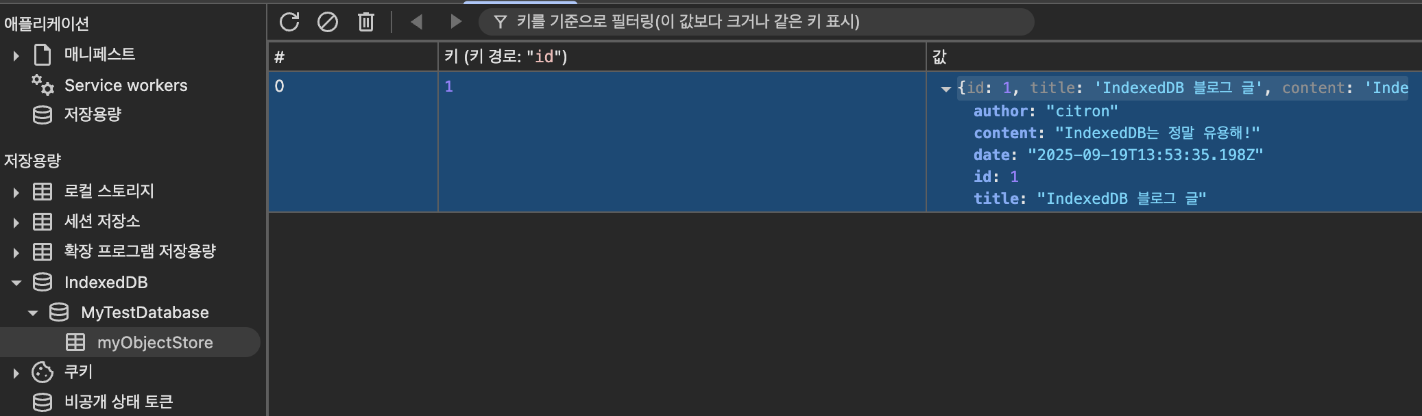 // db 변수는 위에서 성공적으로 열린 데이터베이스 객체 const db = event.target.result; const transaction = db.transaction(['myObjectStore'], 'readwrite'); const objectStore = transaction.objectStore('myObjectStore'); const data = { id: 1, title: 'IndexedDB 블로그 글', content: 'IndexedDB는 정말 유용해!', author: 'citron', date: new Date() }; const addRequest = objectStore.add(data); addRequest.onsuccess = function() { console.log('데이터가 성공적으로 추가되었습니다.'); }; addRequest.onerror = function() { console.error('데이터 추가 오류:', addRequest.error); };🙌 데이터 읽기