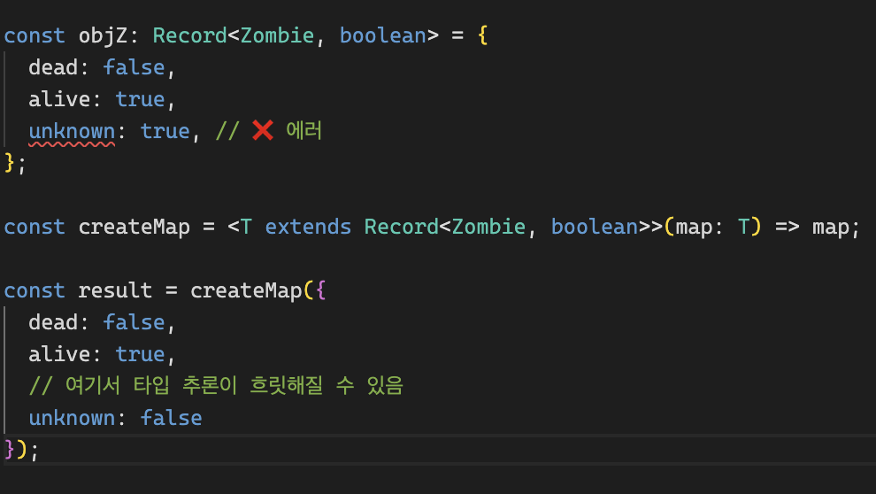 const obj: Record<Zombie, boolean> = { dead: false, alive: true, unknown: true, // ❌ 에러 };당연히 에러가 난다.
